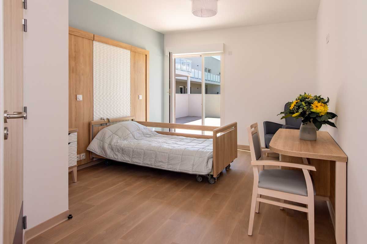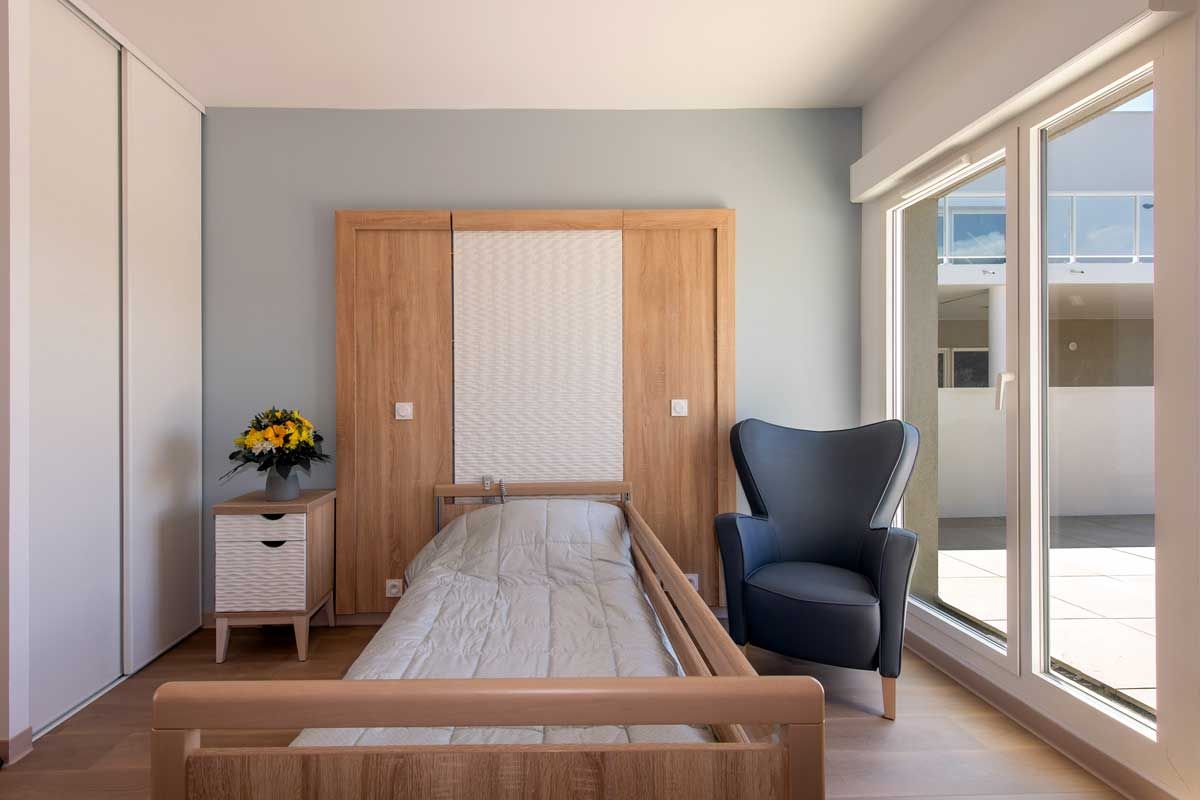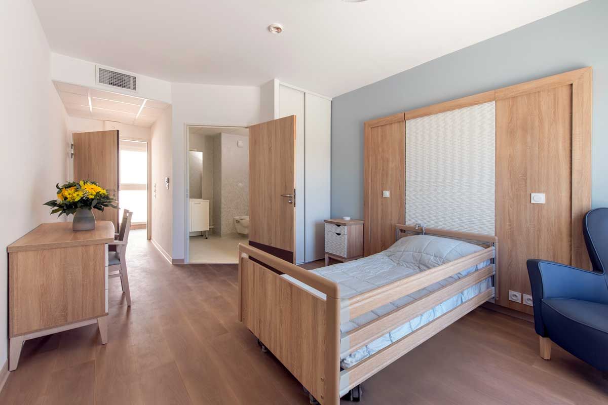 Chaque chambre est équipée d’un lit médicalisé, d’un système d’appel relié 24h/24h à l’équipe médicale, de sa propre salle de bain, d’un bureau, d’une armoire, d’une table de chevet et d’un fauteuil.