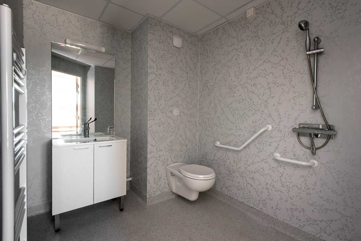 La salle de bain est adaptée aux personnes à mobilité réduite et respecte les norme en vigueur. 10 chambres sont équipées de rails de transfert pour faciliter et sécuriser la prise en charge des grands dépendants.